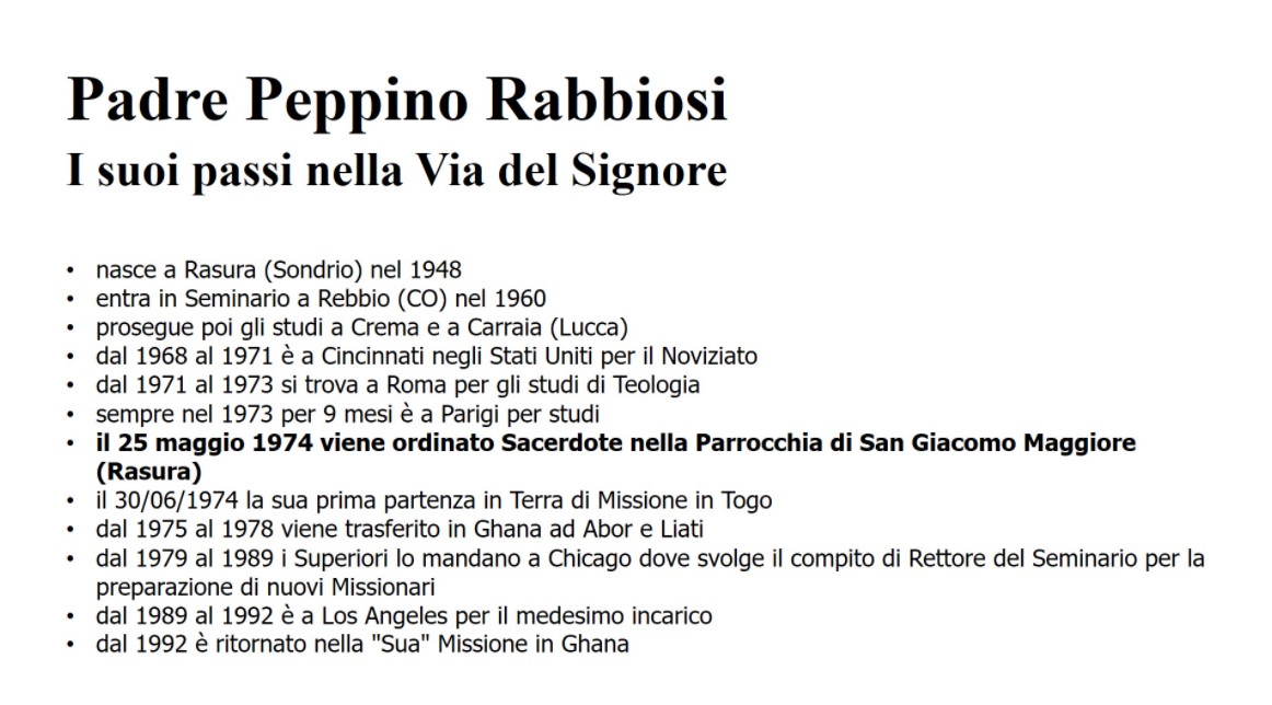 Nel 1974 arriva nel villaggio di Abor il primo missionario comboniano: padre Cuniberto Zeziola di Angolo Terme (Brescia). Presto si uniscono altri missionari, tra i quali padre Giuseppe Rabbiosi che viene assegnato alla Missione di Abor dal 1975 al 1978 e poi dal 1992 per altri 10 anni. Nel 1998 i Comboniani decidono che la Missione di Abor è ormai pronta per essere lasciata nelle mani del clero ghanese. Per questo motivo l’anno seguente padre Peppino inizia a porre le basi di un’organizzazione che possa dare continuità alle iniziative di sviluppo umano intraprese destinate ad esaurirsi senza il sostegno economico e l’impegno a tempo pieno di persone responsabili.